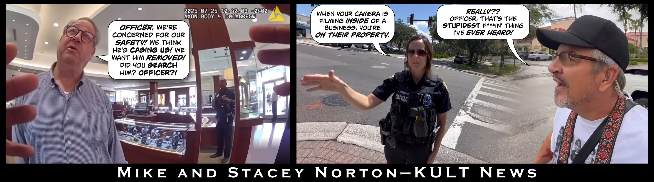 Mike Norton (Kult News) has been auditing for some years now, and specialises in banks. He often records or photographs a glass-fronted bank from the sidewalk. His wife and assistant, Stacey Norton, records from a distance. The bank manager, accompanied by a Karen and a Darren, comes bowling out to accost Mike, make ridiculous demands, and call the police. Officers arrive, take the manager inside the bank, and listen to him whine and cry. They tell him that, unfortunately, there’s nothing they can do because Americans have rights. Mike Norton yells out, “What’s unfortunate about that, officers? Oh, that’s right, you guys hate the Constitution, I forgot.”